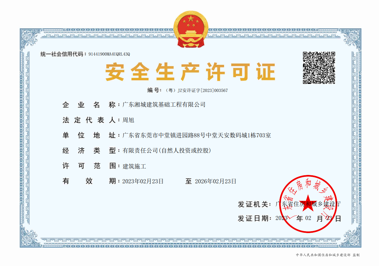 廣東湘城建筑基礎(chǔ)工程有限公司,成立于2016年,注冊(cè)資金4888萬(wàn)元,持有地基基礎(chǔ)工程專業(yè)承包壹級(jí)資質(zhì),具有安全生產(chǎn)許可證。可承接各種基礎(chǔ)類施工,包括各類樁基礎(chǔ)、基坑支護(hù)、邊坡支護(hù)、地基強(qiáng)夯處理等施工業(yè)務(wù)。公司為地基與基礎(chǔ)工程專業(yè)承包、工程施工、技術(shù)咨詢、技術(shù)開發(fā)、技術(shù)服務(wù)、信息咨詢實(shí)體型企業(yè)。